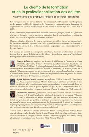 Cet ouvrage met en question et en tension la formation et la professionnalisation des adultes en travaillant principalement sur les thématiques suivantes : les attentes sociales et les enjeux sociaux, le lexique et la sémantique, les pratiques, les postures identitaires et les compétences.