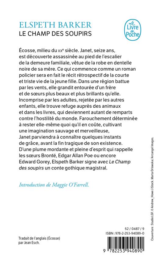 Écosse, au milieu du XXe siècle. Janet, seize ans, est retrouvée assassinée au pied de l’escalier de la demeure familiale, vêtue de la robe en dentelle noire de sa mère. Ce qui commence comme un roman policier sera en fait le récit rétrospectif de la courte et triste vie de Janet. Dans une région battue par les vents, elle grandit entourée de frères et de sœurs plus beaux et plus brillants qu’elle. Incomprise par les adultes, rejetée par les autres enfants, Janet trouve refuge auprès des animaux et dans les livres, qui deviennent autant de remparts contre l’hostilité du monde. Farouchement déterminée à rester elle-même quoi qu’il en coûte, cultivant une imagination sauvage et merveilleuse, Janet parviendra à connaître quelques instants de grâce, avant de finir sa vie tragiquement. D’une plume mordante et pleine d’esprit, qui rappelle à la fois les sœurs Brontë, Edgar Allan Poe ou encore Edward Gorey, Elspeth Barker signe avec Le Champ des soupirs un conte gothique magistral.