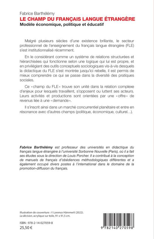 Malgré plusieurs siècles d'une existence brillante, le secteur professionnel de l'enseignement du français langue étrangère (FLE) s'est institutionnalisé récemment. En le considérant comme un système de relations structurées et hiérarchisées qui fonctionne selon une logique qui lui est propre, et en privilégiant des outils conceptuels sociologiques vis-à-vis desquels la didactique du FLE s'est montrée jusqu'ici rebelle, il est permis de mieux comprendre ce qui se passe dans la diversité des pratiques sociales. Ce « champ du FLE » trouve son unité dans la relation complexe d'enjeux pour lesquels travaillent, s'opposent ou luttent ses acteurs. Leurs activités et productions sont orientées par une « offre » de revenus liée à une « demande ». Il s'inscrit ainsi dans un marché concurrentiel planétaire et entre en résonance avec d'autres champs (politique, économique, culturel...).