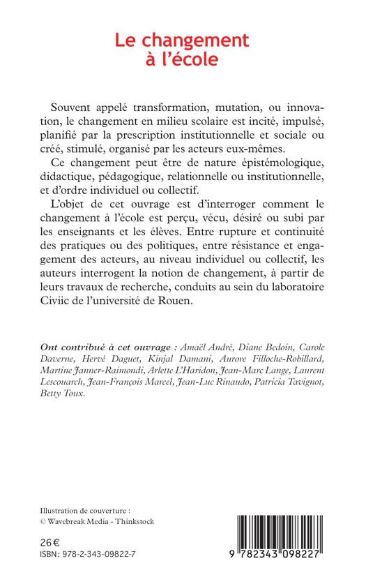 L'objet de cet ouvrage est d'interroger comment le changement à l'école est perçu, vécu, désiré ou subi par les enseignants et les élèves. Entre rupture et continuité des pratiques ou des politiques, entre résistance et engagement des acteurs, au niveau individuel ou collectif, les auteurs interrogent la notion de changement, à partir de leurs travaux de recherche.
