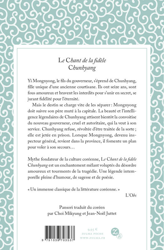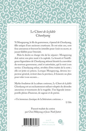 Mythe fondateur de la culture coréenne, Le Chant de la fidèle Chunhyang est un enchantement mêlant voluptés du désordre amoureux et tourments de la tragédie. Une légende intemporelle pleine d'humour, de sagesse et de poésie.