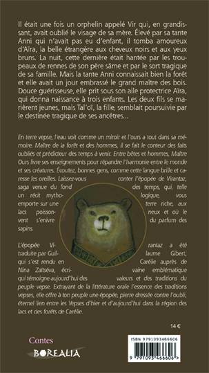 Il était une fois un orphelin appelé Vir qui, en grandissant, avait oublié le visage de sa mère. Élevé par sa tante Anni qui n’avait pas eu d’enfant, il tomba amoureux d’Aïra, la belle étrangère aux cheveux noirs et aux yeux bruns. La nuit, cette dernière était hantée par les troupeaux de rennes de son père sâme et par le sort tragique de sa famille. Mais la tante Anni connaissait bien la forêt et elle avait un jour embrassé le grand maître des bois. Douce guérisseuse, elle prit sous son aile protectrice Aïra, qui donna naissance à trois enfants. Les deux fils se marièrent jeunes, mais Tal'oï, la fille, semblait poursuivie par le destinée tragique de ses ancêtres... - En terre vepse, l’eau voit comme un miroir et l’ours a tout dans sa mémoire. Maître de la forêt et des hommes, il se fait le conteur des faits oubliés et prédicteur des temps à venir. Entre bêtes et hommes, Maître Ours livre ses enseignements pour répandre l’harmonie entre le monde et ses créatures. Écoutez, bonnes gens, comme cette langue brille et caresse les oreilles. Laissez-vous conter l’épopée de Virantaz, saga venue du fond des temps, qui, telle un récit mythologique, vous emporte sur une terre riche, aux lacs poissonneux et où le vent s'enivre du parfum des sapins.