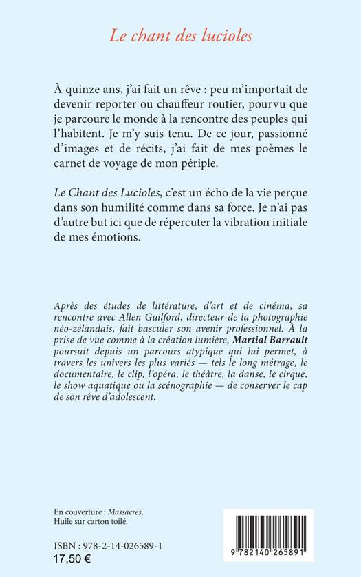 À quinze ans, j’ai fait un rêve : peu m’importait de devenir reporter ou chauffeur routier, pourvu que je parcoure le monde à la rencontre des peuples qui l’habitent. Je m’y suis tenu. De ce jour, passionné d’images et de récits, j’ai fait de mes poèmes le carnet de voyage de mon périple. Le Chant des Lucioles, c’est un écho de la vie perçue dans son humilité comme dans sa force. Je n’ai pas d’autre but ici que de répercuter la vibration initiale de mes émotions.
