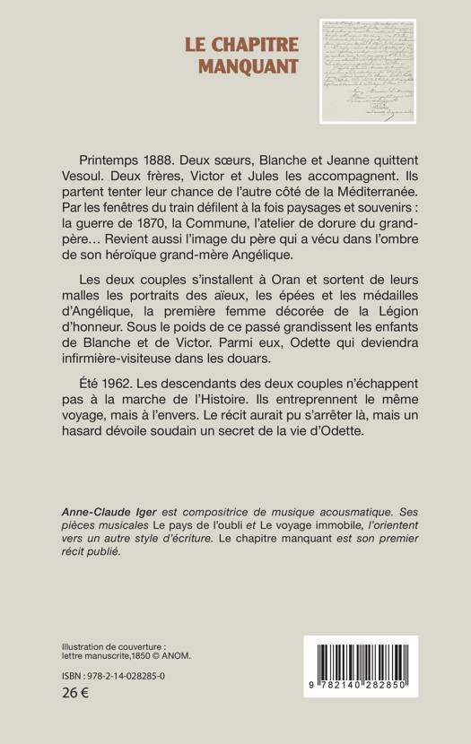 Printemps 1888. Deux soeurs, Blanche et Jeanne quittent Vesoul. Deux frères, Victor et Jules les accompagnent. Ils partent tenter leur chance de l'autre côté de la Méditerranée. Par les fenêtres du train défilent à la fois paysages et souvenirs: la guerre de 1870, la Commune, l'atelier de dorure du grand père... Revient aussi l'image du père qui a vécu dans l'ombre de son héroïque grand-mère Angélique. Les deux couples s'installent à Oran et sortent de leurs malles les portraits des aïeux, les épées et les médailles d'Angélique, la première femme décorée de la Légion d'honneur. Sous le poids de ce passé grandissent les enfants de Blanche et de Victor. Parmi eux, Odette qui deviendra infirmière-visiteuse dans les douars. Été 1962. Les descendants des deux couples n'échappent pas à la marche de l'Histoire. Ils entreprennent le même voyage, mais à l'envers. Le récit aurait pu s'arrêter là, mais un hasard dévoile soudain un secret de la vie d'Odette.