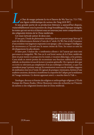 Le Char de nuages presente la vie et l'oeuvre de Wu Yun (ca. 715-778), une figure emblematique du taoisme des Tang (618-907). Si une grande partie de sa production litteraire a aujourd'hui disparu, vraisemblablement sous la pression du clerge bouddhique a l'epoque mongole, les textes qui ont survecu eclairent sous un nouveau jour notre comprehension des religiosites lettrees de la Chine medievale. Cet essai s'articule autour de deux axes. D'une part, l'etude du phenomene eremitique dont on pensait jusqu'alors qu'il avait ete definitivement theorise a l'oree du IVe siecle. Or Wu Yun revele l'existence d'une troisieme voie largement empruntee a son epoque; celle-ci conjugue l'intelligence de circonstance et l'accord avec la nature intime de l'etre. Ses textes en sont les developpements les plus aboutis. D'autre part, l'analyse des randonnees celestes de l'auteur qui nous sont parvenues en integralite. Wu Yun est le seul lettre taoiste de la Chine medievale dont on peut mettre en perspective les traites, a vocation didactique, et les poemes. Cette etude en miroir permet de reconstituer une fonction oubliee de la poesie siderale, un deuxieme niveau de lecture a vocation spirituelle. On s'apercoit alors que ces ecrits ne relevaient pas simplement d'un jeu stylistique et litteraire, ce que l'on considerait jusqu'a present, mais qu'ils constituaient avant tout de veritables supports de meditation reserves a l'initie. Il s'agissait de pratiques visionnaires, heritees d'une tradition ancienne, destinees a transformer la corporeite de l'adepte par la mediation de l'image interieure. Ce dernier apprenait ainsi a marcher dans le Vide.