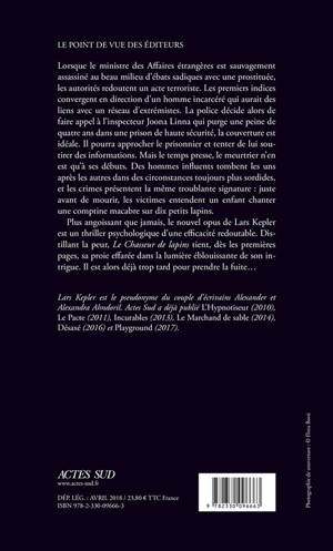Plus angoissant que jamais, le nouvel opus de Lars Kepler est un thriller psychologique d'une efficacité redoutable. Distillant la peur, «Le Chasseur de lapins »tient, dès les premières pages, sa proie effarée dans la lumière éblouissante de son intrigue. Il est alors déjà trop tard pour prendre la fuite...