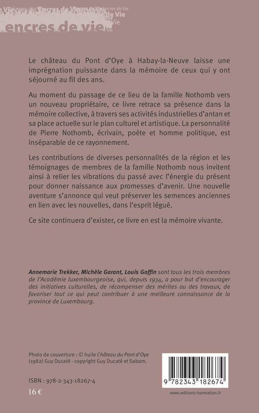 Le château du Pont d'Oye à Habay-la-Neuve laisse une imprégnation puissante dans la mémoire de ceux qui y ont séjourné au fil des ans. Au moment du passage de ce lieu de la famille Nothomb vers un nouveau propriétaire, ce livre retrace sa présence dans la mémoire collective, à travers ses activités industrielles d'antan et sa place actuelle sur le plan culturel et artistique. La personnalité de Pierre Nothomb, écrivain, poète et homme politique, est inséparable de ce rayonnement. Les contributions de diverses personnalités de la région et les témoignages de membres de la famille Nothomb nous invitent ainsi à relier les vibrations du passé avec l'énergie du présent pour donner naissance aux promesses d'avenir. Une nouvelle aventure s'annonce qui veut préserver les semences anciennes en lien avec les nouvelles, dans l'esprit légué. Ce site continuera d'exister, ce livre en est la mémoire vivante.