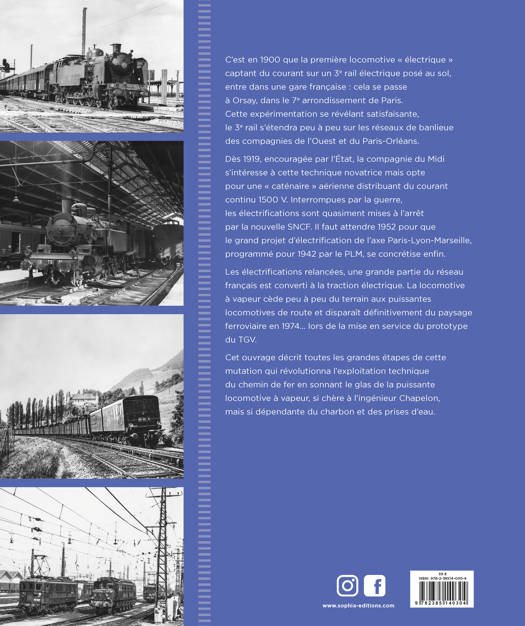 En 1900, la première locomotive « électrique » captant du courant électrique sur un 3e rail électrique posé au sol, entre dans une gare française : cela se passe à Orsay, dans le 7e arrondissement de Paris. Cette expérimentation se révélant satisfaisante, le 3e rail s’étend peu à peu sur les réseaux de banlieue des compagnies de l’Ouest et du Paris-Orélans. Dès 1919, encouragé par l’État, la compagnie du Midi s’intéresse à cette technique novatrice mais opte pour une « caténaire » aérienne distribuant du courant continu 1500 V. Interrompues par la guerre, les électrifications sont quasiment mises à l’arrêt par la nouvelle SNCF. Il faut attendre 1952 pour que le grand projet d’électrification de l’axe Paris-Lyon-Marseille, programmé pour 1942 par le PLM, se concrétise enfin. Les électrifications relancées, une grande partie du réseau français est converti à la traction électrique. La locomotive à vapeur cède peu à peu du terrain aux puissantes locomotives de route et disparaît définitivement du paysage ferroviaire en 1974… lors de la mise en service du prototype du TGV. Cet ouvrage décrit toutes les grandes étapes de cette mutation qui révolutionna l’exploitation technique du chemin de fer en sonnant le glas de la puissante locomotive à vapeur, si chère à l’ingénieur Chapelon, mais si dépendante du charbon et des prises d’eau.