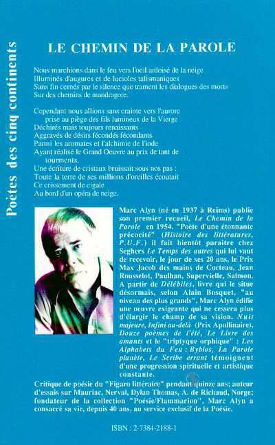 Sous ce titre, qui est sa première oeuvre, parue en 1954, Marc Alyn publie un choix de ses poèmes couvrant quarante années de création, depuis les plaquettes de ses 17 ans jusqu'au Triptyque orphique de sa maturité.