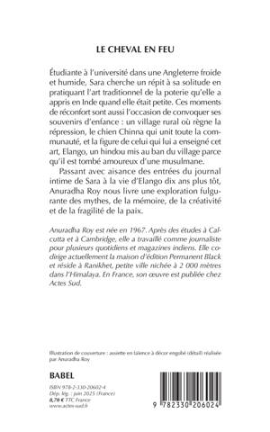 Étudiante à l'université dans une Angleterre froide et humide, Sara cherche un répit à sa solitude en pratiquant l'art traditionnel de la poterie qu'elle a appris en Inde quand elle était petite. Ces moments de réconfort sont aussi l'occasion de convoquer ses souvenirs d'enfance : un village rural où règne la répression, le chien Chinna qui unit toute la communauté, et la figure de celui qui lui a enseigné cet art, Elango, un hindou mis au ban du village parce qu'il est tombé amoureux d'une musulmane. Passant avec aisance des entrées du journal intime de Sara à la vie d'Elango dix ans plus tôt, Anuradha Roy nous livre une exploration fulgurante des mythes, de la mémoire, de la créativité et de la fragilité de la paix.