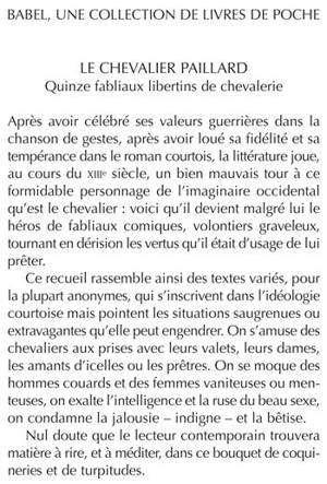 Après avoir célébré ses valeurs guerrières dans la chanson de gestes, après avoir loué sa fidélité et sa tempérance dans le roman courtois, la littérature joue, au cours du XIIIe siècle, un bien mauvais tour à ce formidable personnage de l'imaginaire occidental qu'est le chevalier : voici qu'il devient malgré lui le héros de fabliaux comiques, volontiers graveleux, tournant en dérision les vertus qu'il était d'usage de lui prêter. Ce recueil rassemble ainsi des textes variés, pour la plupart anonymes, qui s'inscrivent dans l'idéologie courtoise mais pointent les situations saugrenues ou extravagantes qu'elle peut engendrer. On s'amuse des chevaliers aux prises avec leurs valets, leurs dames, les amants d'icelles ou les prêtres. On se moque des hommes couards et des femmes vaniteuses ou menteuses, on exalte l'intelligence et la ruse du beau sexe, on condamne la jalousie - indigne - et la bêtise. Nul doute que le lecteur contemporain trouvera matière à rire, et à méditer, dans ce bouquet de coquineries et de turpitudes.