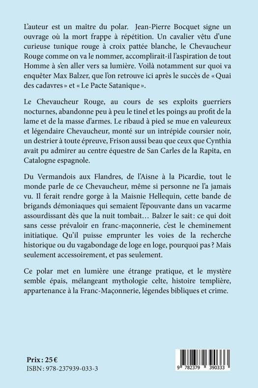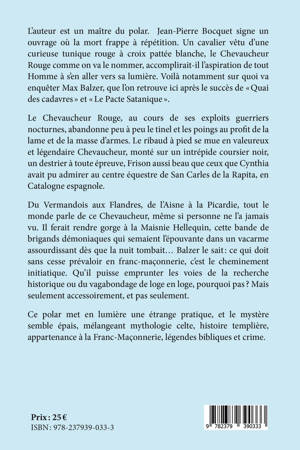 Un assassin tue la nuit tombée. Il entoure ses crimes d'un halo mystérieux que seul pourra comprendre l'enquêteur franc-maçon car les références aux légendes et aux symboles celtes, maçonniques et prétendument templiers ne manquent pas. On apprendra qui se cache derrière le Chevaucheur habillé d'un rouge sacré et pourquoi il agit. Max Balzer mène une nouvelle enquête, poignante teintée d'informations relatives à des secrets et des mystères plongeant leurs sources dans la bible, la franc-maçonnerie et les néo-templiers. Une visite des coulisses imaginées par l'auteur au sein de sociétés secrètes. L'auteur amplifie sa maîtrise du polar. Le Chevaucheur Rouge ouvre des horizons qui vont au-delà de l'enquête policière, et révèle les vertus de la vraie Force, donne à connaître quelques secrets bien gardés et touche à des milieux méconnus ; une histoire fictive, mais peut-être pas tant que cela. A chacun de vérifier...