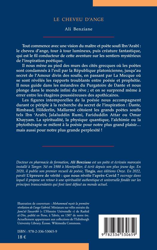 Tout commence avec une vision du maître et poète soufi Ibn 'Arabî le cheveu d'ange, tour à tour lumineux, puis créature fantastique, qui est le fil conducteur de cette aventure sur les sentiers mystérieux de l'inspiration poétique. Il nous mène au pied des murs des cités grecques où les poètes sont condamnés à l'exil par la République platonicienne, jusqu'au secret de l'Amour divin des soufis, en passant par La Mecque où se sont révélés les rapports troublants entre poésie et prophétie. Il nous guide dans les méandres du Purgatoire de Dante et nous plonge dans le monde infini du rêve; et on se surprend même à errer entre les étagères poussiéreuses des apothicaires. Les figures intemporelles de la poésie nous accompagnent durant ce périple à la recherche du secret de l'inspiration: Dante, Rimbaud, Hölderlin, Mallarmé côtoient les grands poètes soufis tels Ibn 'Arabî, Jalaluddin Rumi, Fariduddin Attar ou Omar Khayyam. La spiritualité, la physique quantique, l'alchimie ou la phytothérapie se mêlent à la poésie pour notre plus grand plaisir... mais aussi pour notre plus grande perplexité !