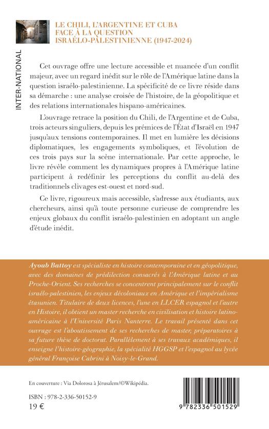 Cet ouvrage offre une lecture accessible et nuancée d'un conflit majeur, avec un regard inédit sur le rôle de l'Amérique latine dans la question israélo-palestinienne. La spécificité de ce livre réside dans sa démarche: une analyse croisée de l'histoire, de la géopolitique et des relations internationales hispano-américaines. L'ouvrage retrace la position du Chili, de l'Argentine et de Cuba, trois acteurs singuliers, depuis les prémices de l'État d'Israël en 1947 jusqu'aux tensions contemporaines. Il met en lumière les décisions diplomatiques, les engagements symboliques, et l'évolution de ces trois pays sur la scène internationale. Par cette approche, le livre révèle comment les dynamiques propres à l'Amérique latine participent à redéfinir les perceptions du conflit au-delà des traditionnels clivages est-ouest et nord-sud. Ce livre, rigoureux mais accessible, s'adresse aux étudiants, aux chercheurs, ainsi qu'à toute personne curieuse de comprendre les enjeux globaux du conflit israélo-palestinien en adoptant un angle d'étude inédit.