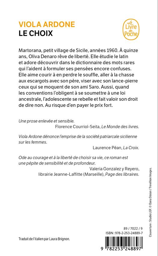 Martorana, petit village de Sicile, années 1960. À quinze ans, Oliva Denaro rêve de liberté. Elle étudie le latin et adore découvrir dans le dictionnaire des mots rares qui l’aident à formuler ses pensées encore confuses. Elle aime courir à en perdre le souffle, aller à la chasse aux escargots avec son père, viser avec son lance-pierre ceux qui se moquent de son ami Saro. Aussi, quand les conventions l’obligent à se soumettre à une loi ancestrale, l’adolescente se rebelle et fait valoir son droit de dire non. Au risque d’en payer le prix fort.