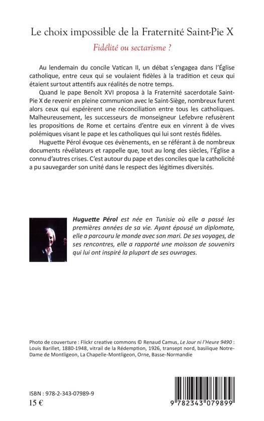 Huguette Pérol évoque, à l'aide de nombreux documents de référence, les débats et la crise qui survint au sein de la Fraternité Saint-Pie X, au lendemain du concile Vatican II, quand les successeurs de monseigneur Lefebvre refusèrent les propositions de Rome. Tout au long des siècles, l'Eglise a connu d'autres crises. C'est autour du pape et des conciles que la catholicité a pu sauvegarder son unité dans le respect des légitimes diversités.