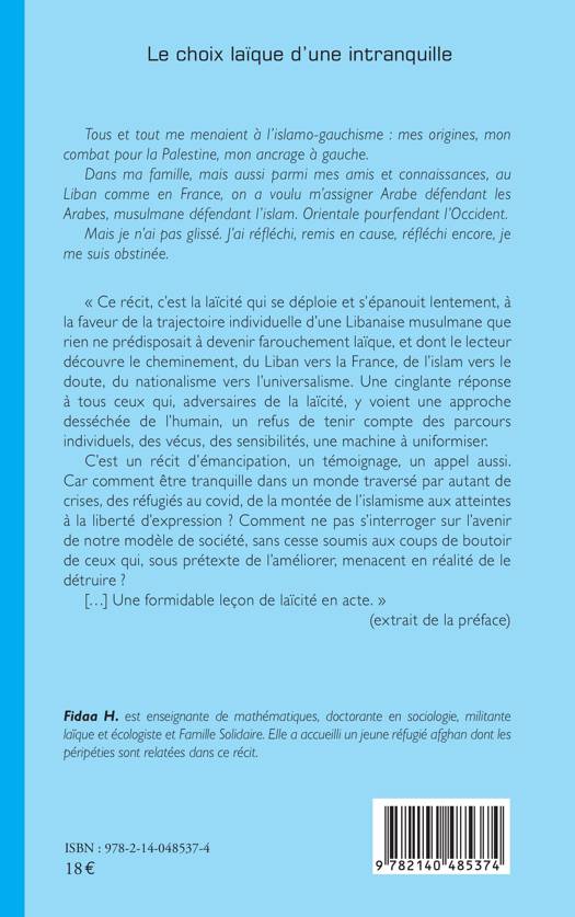 Tous et tout me menaient à l’islamo-gauchisme : mes origines, mon combat pour la Palestine, mon ancrage à gauche. Dans ma famille, mais aussi parmi mes amis et connaissances, au Liban comme en France, on a voulu m’assigner Arabe défendant les Arabes, musulmane défendant l’islam. Orientale pourfendant l’Occident. Mais je n’ai pas glissé. J’ai réfléchi, remis en cause, réfléchi encore, je me suis obstinée. « Ce récit, c’est la laïcité qui se déploie et s’épanouit lentement, à la faveur de la trajectoire individuelle d’une Libanaise musulmane que rien ne prédisposait à devenir farouchement laïque, et dont le lecteur découvre le cheminement, du Liban vers la France, de l’islam vers le doute, du nationalisme vers l’universalisme. Une cinglante réponse à tous ceux qui, adversaires de la laïcité, y voient une approche desséchée de l’humain, un refus de tenir compte des parcours individuels, des vécus, des sensibilités, une machine à uniformiser. C’est un récit d’émancipation, un témoignage, un appel aussi. Car comment être tranquille dans un monde traversé par autant de crises, des réfugiés au covid, de la montée de l’islamisme aux atteintes à la liberté d’expression ? Comment ne pas s’interroger sur l’avenir de notre modèle de société, sans cesse soumis aux coups de boutoir de ceux qui, sous prétexte de l’améliorer, menacent en réalité de le détruire ? […] Une formidable leçon de laïcité en acte. » (extrait de la préface)