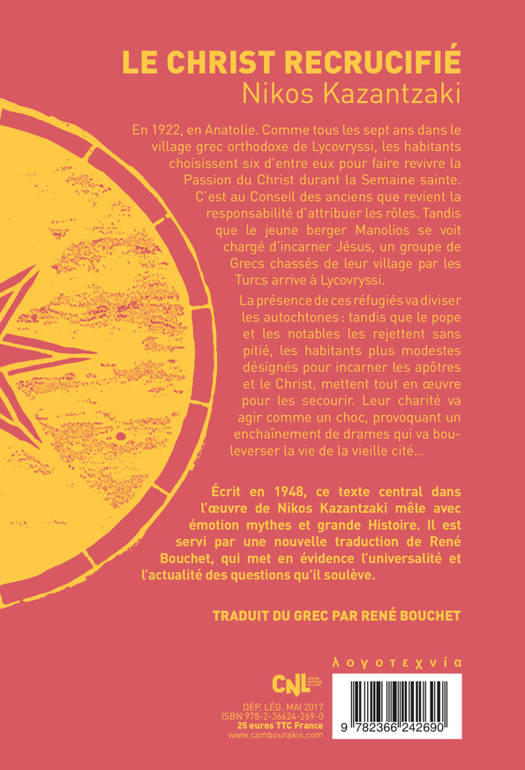 1922, en Anatolie. Comme tous les sept ans dans le village grec orthodoxe de Lycovryssi, les habitants choisissent six d'entre eux pour faire revivre la Passion du Christ durant la Semaine sainte. C'est au Conseil des anciens que revient la responsabilité d'attribuer les rôles. Tandis que le jeune berger Manolios se voit chargé d'incarner Jésus, un groupe de Grecs chassés de leur village par les Turcs arrive à Lycovryssi. La présence de ces réfugiés va diviser les autochtones : tandis que le pope et les notables les rejettent sans pitié, les habitants plus modestes désignés pour incarner les apôtres et le Christ mettent tout en oeuvre pour les secourir. Leur charité va agir comme un choc, provoquant un enchaînement de drames qui bouleversera la vie de la vieille cité... Écrit en 1948, ce texte central dans l'oeuvre de Nikos Kazantzaki mêle avec émotion mythes et grande Histoire. Il est servi par une nouvelle traduction de René Bouchet, qui met en évidence l'universalité et l'actualité des questions qu'il soulève.