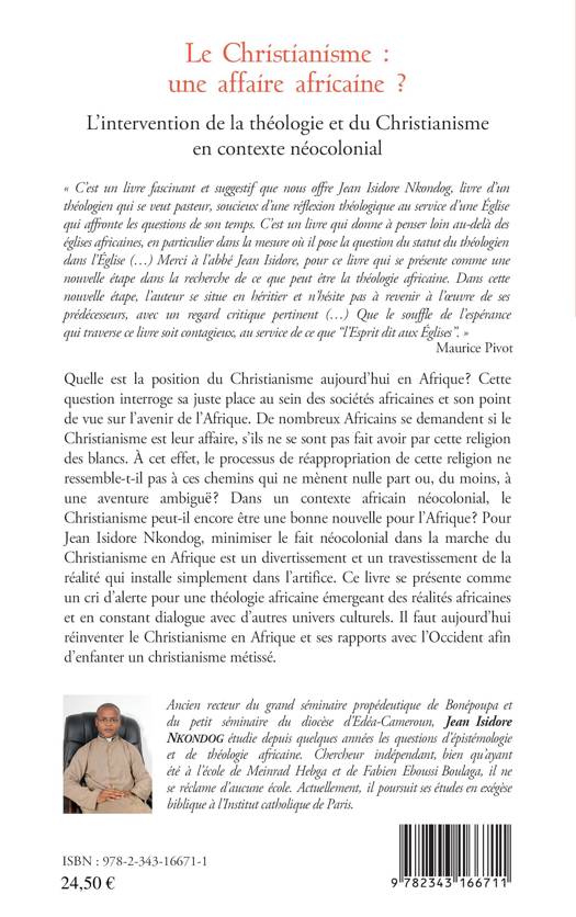 Quelle est la position du Christianisme aujourd'hui en Afrique ? Cette question interroge sa juste place au sein des sociétés africaines et son point de vue sur l'avenir de l'Afrique. Ce livre se présente comme un cri d'alerte pour une théologie africaine émergeant des réalités africaines et en constant dialogue avec d'autres univers culturels. Il faut aujourd'hui réinventer le Christianisme en Afrique et ses rapports avec l'Occident afin d'enfanter un christianisme métissé.