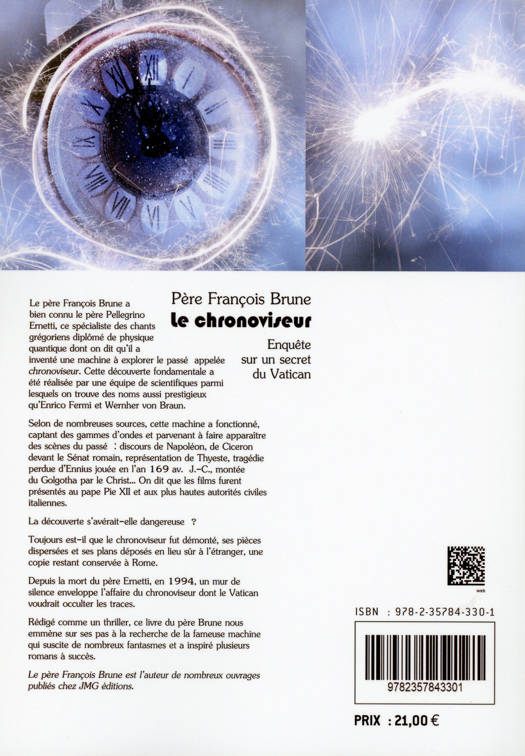 Le père François Brune a bien connu le père Pellegrino Ernetti, ce spécialiste des chants grégoriens diplômé de physique quantique dont on dit qu’il a inventé une machine à explorer le passé appelée chronoviseur. Cette découverte fondamentale a été réalisée par une équipe de scientifiques parmi lesquels on trouve des noms aussi prestigieux qu’Enrico Fermi et Wernher von Braun. Selon de nombreuses sources, cette machine a fonctionné, captant des gammes d’ondes et parvenant à faire apparaître des scènes du passé : discours de Napoléon, de Ciceron devant le Sénat romain, représentation de Thyeste, tragédie perdue d'Ennius jouée en l'an 169 av. J.-C., montée du Golgotha par le Christ… On dit que les films furent présentés au pape Pie XII et aux plus hautes autorités civiles italiennes. La découverte s’avérait-elle dangereuse ? Toujours est-il que le chronoviseur fut démonté, ses pièces dispersées et ses plans déposés en lieu sûr à l’étranger, une copie restant conservée à Rome. Depuis la mort du père Ernetti en 1994 un mur du silence enveloppe l’affaire du chronoviseur dont le Vatican voudrait occulter les traces. Rédigé comme un thriller, ce livre du père Brune nous emmène sur ses pas à la recherche de la fameuse machine qui suscite fantasmes et a inspiré plusieurs romans à succès.