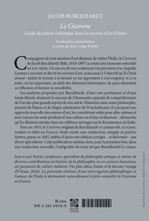 Compagnon de tout amateur d'art desireux de visiter l'Italie, le Cicerone de Jacob Burckhardt (Bale, 1818-1897) a connu une immense notoriete au XIXe siecle. Un succes du non seulement a la precision avec laquelle l'auteur a recense et decrit les oeuvres d'art, mais aussi a l'objectif qu'il s'etait donne: initier le lecteur a la beaute en lui apprenant a s'en emparer et a en jouir, en lui apportant, au-dela des elements historiques, de quoi alimenter sa reflexion et former sa sensibilite.Les analyses proposees par Burckhardt, d'une rare pertinence et d'une totale liberte, donnent la mesure de l'etonnante capacite de comprehension de l'un des plus grands esprits de son siecle. Historien mais aussi philosophe, penetre de Platon et de Hegel, admirateur de Winckelmann, il a propose une approche nouvelle des oeuvres d'art, les considerant enfin pour elles-memes et non comme les seuls produits d'une culture ou d'une civilisation - demarche qu'il a illustree ensuite dans ses celebres ouvrages sur la Renaissance en Italie.Paru en 1855, le Cicerone original de Burckhardt n'a jamais ete, a ce jour, traduit et edite en France. Seule existe une traduction, inegale et parfois fautive, parue en 1885, etablie d'apres une edition corrigee - et deformee - par divers specialistes. Cette publication restitue donc pour la premiere fois, dans une traduction nouvelle, l'integralite du texte tel que Burckhardt l'a concu.