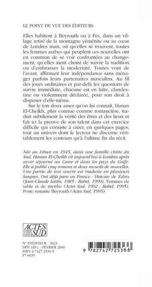 Elles habitent à Beyrouth ou à Fès, dans un village retiré de la montagne yéménite ou au coeur de Londres mais, où qu'elles se trouvent, toutes les femmes arabes qui peuplent ces nouvelles ont en commun de se voir confrontées au changement, qu'elles aient choisi de suivre la tradition ou d'embrasser la modernité. Toutes vont de l'avant, affirmant leur indépendance sans ménager parfois leurs partenaires masculins. Au fil des jours ordinaires et par-delà les questions de survie immédiate, chacune est en lutte, clandestine ou violemment déclarée, pour son droit à disposer d'elle-même.