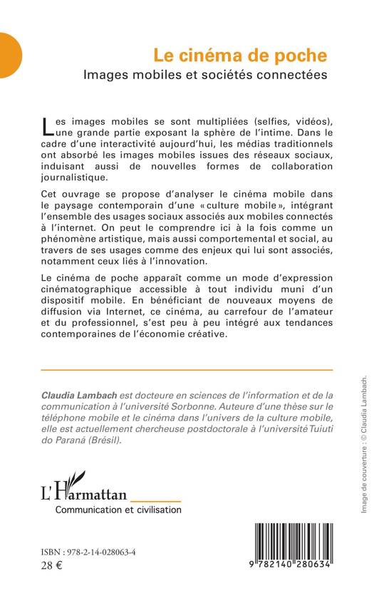 Les images mobiles se sont multipliées (selfies, vidéos), une grande partie exposant la sphère de l'intime. Dans le cadre d'une interactivité aujourd'hui, les médias traditionnels ont absorbé les images mobiles issues des réseaux sociaux, induisant aussi de nouvelles formes de collaboration journalistique. Cet ouvrage se propose d'analyser le cinéma mobile dans le paysage contemporain d'une culture mobile, intégrant l'ensemble des usages sociaux associés aux mobiles connectés à l'internet. On peut le comprendre ici à la fois comme un phénomène artistique, mais aussi comportemental et social, au travers de ses usages comme des enjeux qui lui sont associés, notamment ceux liés à l'innovation. Le cinéma de poche apparaît comme un mode d'expression cinématographique accessible à tout individu muni d'un dispositif mobile. En bénéficiant de nouveaux moyens de diffusion via Internet, ce cinéma, au carrefour de l'amateur et du professionnel, s'est peu à peu intégré aux tendances contemporaines de l'économie créative.
