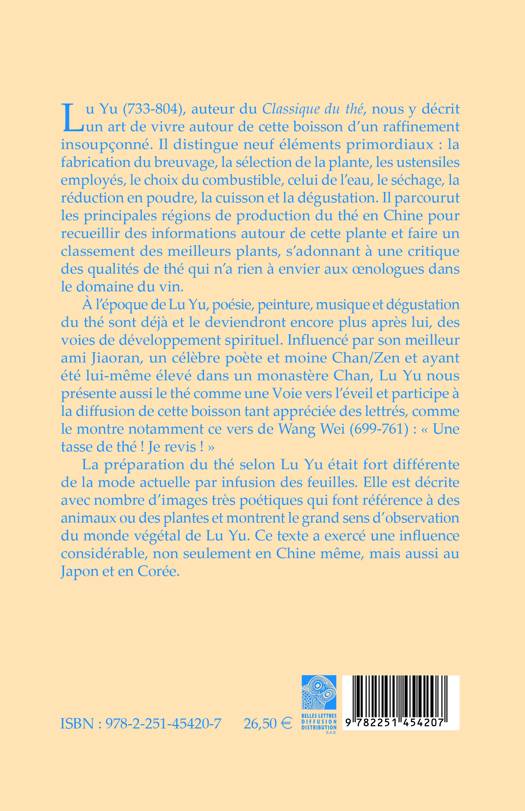 Lu Yu (733-804), auteur du Classique du the, nous y decrit un art de vivre autour de cette boisson d'un raffinement insoupconne. Il distingue neuf elements primordiaux: la fabrication du breuvage, la selection de la plante, les ustensiles employes, le choix du combustible, celui de l'eau, le sechage, la reduction en poudre, la cuisson et la degustation. Il parcourut les principales regions de production du the en Chine pour recueillir des informations autour de cette plante et faire un classement des meilleurs plants, s'adonnant a une critique des qualites de the qui n'a rien a envier aux oenologues dans le domaine du vin. A l'epoque de Lu Yu, poesie, peinture, musique et degustation du the sont deja et le deviendront encore plus apres lui, des voies de developpement spirituel. Influence par son meilleur ami Jiaoran, un celebre poete et moine Chan/Zen et ayant ete lui-meme eleve dans un monastere Chan, Lu Yu nous presente aussi le the comme une Voie vers l'eveil et participe a la diffusion de cette boisson tant appreciee des lettres, comme le montre notamment ce vers de Wang Wei (699-761): Une tasse de the ! Je revis ! La preparation du the selon Lu Yu etait fort differente de la mode actuelle par infusion des feuilles. Elle est decrite avec nombre d'images tres poetiques qui font reference a des animaux ou des plantes et montrent le grand sens d'observation du monde vegetal de Lu Yu. Ce texte a exerce une influence considerable, non seulement en Chine meme, mais aussi au Japon et en Coree.