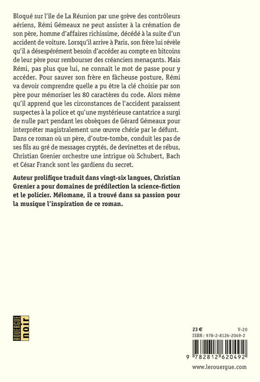 Bloqué sur l'île de La Réunion par une grève des contrôleurs aériens, Rémi Gémeaux ne peut assister à la crémation de son père, homme d'affaires richissime, décédé à la suite d'un accident de voiture. Lorsqu'il arrive à Paris, son frère lui révèle qu'il a désespérément besoin d'accéder au compte en bitcoins de leur père pour rembourser des créanciers menaçants. Mais Rémi, pas plus que lui, ne connaît le mot de passe pour y accéder. Pour sauver son frère en fâcheuse posture, Rémi va devoir comprendre quelle a pu être la clé choisie par son père pour mémoriser les 80 caractères du code. Alors même qu'il apprend que les circonstances de l'accident paraissent suspectes à la police et qu'une mystérieuse cantatrice a surgi de nulle part pendant les obsèques de Gérard Gémeaux pour interpréter magistralement une oeuvre chérie par le défunt. Dans ce roman où un père, d'outre-tombe, conduit les pas de ses fils au gré de messages cryptés, de devinettes et de rébus, Christian Grenier orchestre une intrigue où Schubert, Bach et César Franck sont les gardiens du secret.