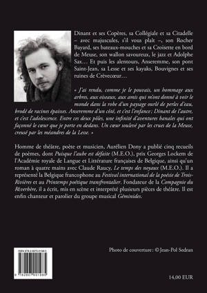 Dinant et ses Copères, sa Collégiale et sa Citadelle - avec majuscules, s'il vous plaît -, son Rocher Bayard, ses bateaux-mouches et sa Croisette en bord de Meuse, son wallon savoureux, le jazz et Adolphe Sax... Et puis les alentours, Anseremme, son pont Saint-Jean, sa Lesse et ses kayaks, Bouvignes et ses ruines de Crèvecoeur... « J'ai rendu, comme je le pouvais, un hommage aux arbres, aux oiseaux, aux amis qui m'ont donné à voir le monde dans la robe d'un paysage ourlé de perles d'eau, brodé de racines épaisses. Anseremme d'un côté, et c'est l'enfance?; Dinant de l'autre, et c'est l'adolescence. Entre ces deux pôles, une infinité d'aventures banales qui ont façonné le coeur que je porte en dedans. Un coeur soulevé par les crues de la Meuse, creusé par les méandres de la Lesse. ». Le premier recueil de nouvelles d'un jeune poète primé par l'Académie belhe, par ailleurs homme de théâtre et musicien.