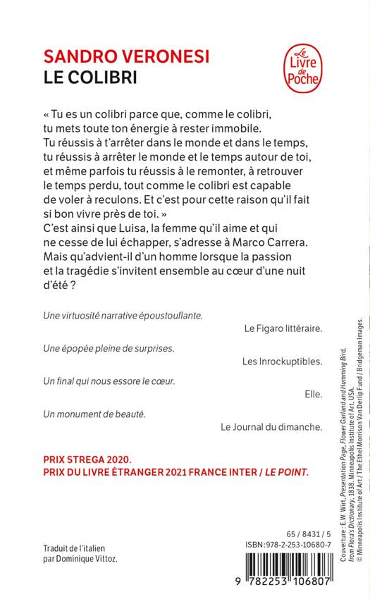 « Tu es un colibri parce que, comme le colibri, tu mets toute ton énergie à rester immobile. Tu réussis à t’arrêter dans le monde et dans le temps, tu réussis à arrêter le monde et le temps autour de toi, et même parfois tu réussis à le remonter, à retrouver le temps perdu, tout comme le colibri est capable de voler à reculons. Et c’est pour cette raison qu’il fait si bon vivre près de toi. »