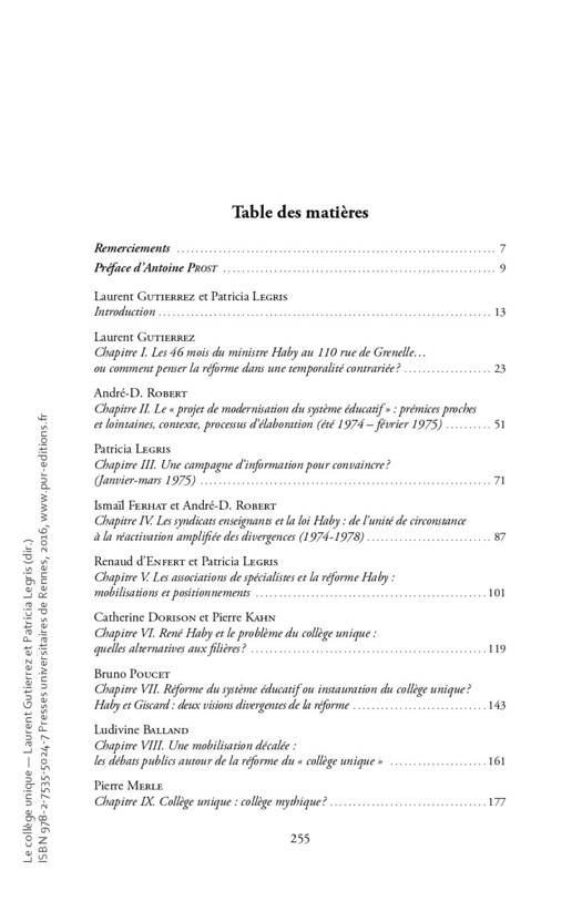cette institution jugée aujourd’hui inégalitaire et obsolète. En reprenant notamment la genèse des travaux qui ont conduit à l’adoption du collège unique, les auteurs de cet ouvrage apportent des éléments nouveaux sur le projet initial de celui qui en fut l’un des principaux instigateurs, René Haby. Le projet de modernisation du système éducatif annoncé par le ministre de l’Éducation dès 1974 est analysé au regard des enjeux mais aussi des résistances que celui-ci rencontra aussi bien auprès des dirigeants politiques, des syndicats que des associations de spécialistes. La question fondamentale des alternatives aux filières est discutée à une époque où la communication (presse, radio, télévision) devient un argument majeur pour convaincre les Français des bienfaits des réformes à mener d’ici l’an 2000. Enfin, le collège unique, devenu « mythique », est interrogé au regard des résultats qu’il produit, laissant apparaître les limites des buts initiaux.