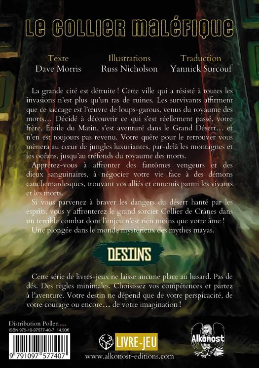 La grande cité est détruiteâ! Cette ville qui a résisté à toutes les invasions n’est plus qu’un tas de ruines. Les survivants affirment que ce saccage est l’oeuvre de loups-garous, venus du royaume des morts... Décidé à découvrir ce qui s’est réellement passé, votre frère, Étoile du Matin, s’est aventuré dans le Grand Désert... et n’en est toujours pas revenu. Votre quête pour le retrouver vous mènera au coeur de jungles luxuriantes, par-delà les montagnes et les océans, jusqu’au tréfonds du royaume des morts.<br /> Apprêtez-vous à affronter des fantômes vengeurs et des dieux sanguinaires, à négocier votre vie face à des démons cauchemardesques, trouvant vos alliés et ennemis parmi les vivants et les morts.<br /> Si vous parvenez à braver les dangers du désert hanté par les esprits, vous y affronterez le grand sorcier Collier de Crânes dans un terrible combat dont l’enjeu n’est rien moins que votre âmeâ!<br /> Une plongée dans le monde mystérieux des mythes mayas.