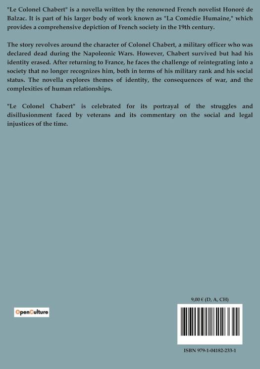 "Le Colonel Chabert" is a novella written by the renowned French novelist Honoré de Balzac. It is part of his larger body of work known as "La Comédie Humaine," which provides a comprehensive depiction of French society in the 19th century.