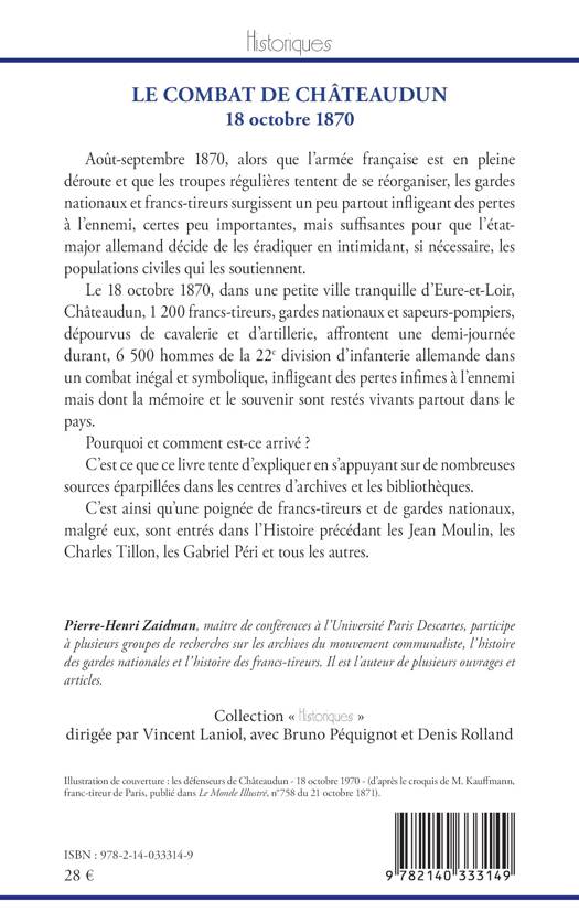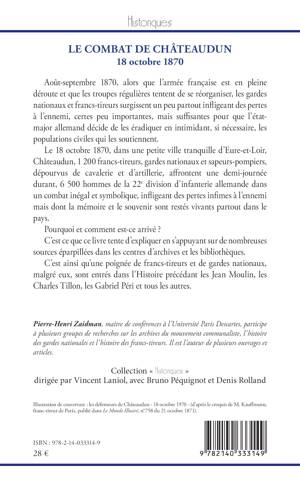 Août-septembre 1870, alors que l'armée française est en pleine déroute et que les troupes régulières tentent de se réorganiser, les gardes nationaux et francs-tireurs surgissent un peu partout infligeant des pertes à l'ennemi, certes peu importantes, mais suffisantes pour que l'état-major allemand décide de les éradiquer en intimidant, si nécessaire, les populations civiles qui les soutiennent. Le 18 octobre 1870, dans une petite ville tranquille d'Eure-et-Loir, Châteaudun, 1 200 francs-tireurs, gardes nationaux et sapeurs-pompiers, dépourvus de cavalerie et d'artillerie, affrontent une demi-journée durant, 6 500 hommes de la 22e division d'infanterie allemande dans un combat inégal et symbolique, infligeant des pertes infimes à l'ennemi mais dont la mémoire et le souvenir sont restés vivants partout dans le pays. Pourquoi et comment est-ce arrivé ? C'est ce que ce livre tente d'expliquer en s'appuyant sur de nombreuses sources éparpillées dans les centres d'archives et les bibliothèques. C'est ainsi qu'une poignée de francs-tireurs et de gardes nationaux, malgré eux, sont entrés dans l'Histoire précédant les Jean Moulin, les Charles Tillon, les Gabriel Péri et tous les autres.