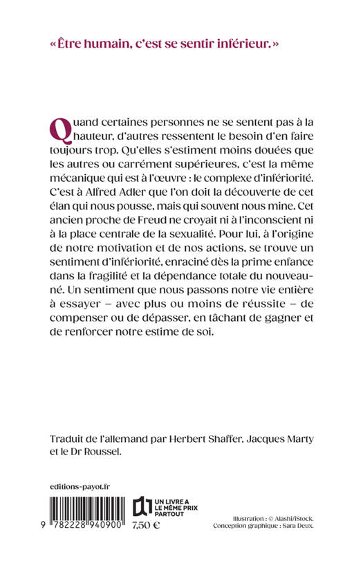Quand certaines personnes ne se sentent pas à la hauteur, d'autres ressentent le besoin d'en faire toujours trop. Qu'elles s'estiment moins douées que les autres ou carrément supérieures, c'est la même mécanique qui est à l'oeuvre : le complexe d'infériorité. C'est à Alfred Adler que l'on doit la découverte de cet élan qui nous pousse, mais qui souvent nous mine. Cet ancien proche de Freud ne croyait ni à l'inconscient ni à la place centrale de la sexualité. Pour lui, à l'origine de notre motivation et de nos actions, se trouve un sentiment d'infériorité, enraciné dès la prime enfance dans la fragilité et la dépendance totale du nouveau-né. Un sentiment que nous passons notre vie entière à essayer - avec plus ou moins de réussite - de compenser ou de dépasser, en tâchant de gagner et de renforcer notre estime de soi.