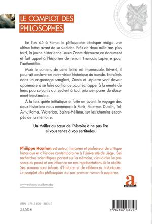 En l'an 65 à Rome, le philosophe Sénèque rédige une ultime lettre avant de se suicider. Près de deux mille ans plus tard, la jeune historienne Laura Zante découvre ce document et fait appel à l'historien de renom François Lapierre pour l'authentifier. Mais le contenu de cette lettre est impensable. Révélé, il pourrait bouleverser notre vision historique du monde. Entraînés dans un engrenage sanglant, Zante et Lapierre vont devoir apprendre à se faire confiance pour échapper à la meute de leurs poursuivants qui veulent à tout prix s'emparer du document inestimable. À la fois quête initiatique et fuite en avant, le voyage des deux historiens nous emmènera à Paris, Palerme, Dublin, Tel-Aviv, Rome, Waterloo, Sainte-Hélène, sur les chemins escarpés de la mémoire. Un thriller au coeur de l'histoire à ne pas lire si vous tenez à vos certitudes.