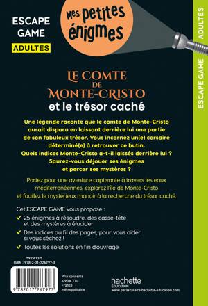 Une légende raconte que le comte de Monte-Cristo aurait disparu en laissant derrière lui une partie de son fabuleux trésor. Vous incarnez un(e) corsaire déterminé(e) à retrouver ce butin. Quels indices Monte-Cristo a-t-il laissés derrière lui ? Saurez-vous déjouer ses énigmes et percer ses mystères ?