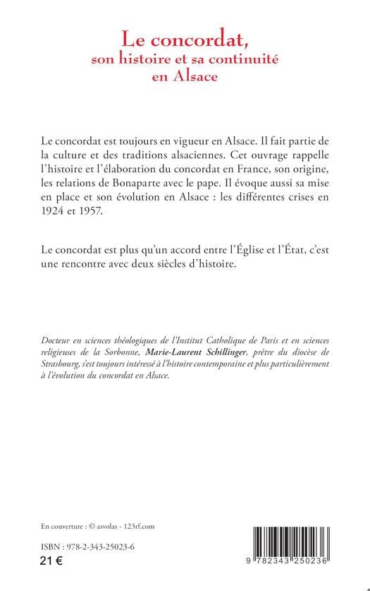 Le concordat est toujours en vigueur en Alsace. Il fait partie de la culture et des traditions alsaciennes. Cet ouvrage rappelle l’histoire et l’élaboration du concordat en France, son origine, les relations de Bonaparte avec le pape. Il évoque aussi sa mise en place et son évolution en Alsace : les différentes crises en 1924 et 1957. Le concordat est plus qu’un accord entre l’Église et l’État, c’est une rencontre avec deux siècles d’histoire.