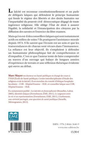 L'ouvrage étudie la fonction d'assistance morale en institutions de soins. Il aborde les questions de compliance du patient, de l'approche éthique, dans la médecine et les questions qui relèvent de la spiritualité évoqué à une oreille attentive ; mais aussi les bases légales de l'assistance morale et apporte au lecteur des exemples de véritables relations de personnes à personnes. Il aide le praticien à cerner la question de la relation d'aide qui définit le travail du conseiller laïque.