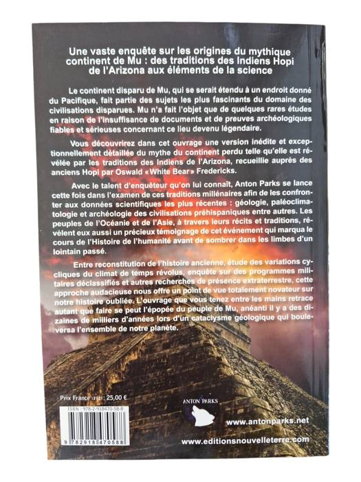 Une vaste enquête sur les origines du mythique continent de Mu : des traditions des Indiens Hopis de l’Arizona aux éléments de la scienceLe continent disparu de Mu, qui se serait étendu à un endroit donné du Pacifique, fait partie des sujets les plus fascinants du domaine des civilisations disparues. Mu n’a fait l’objet que de quelques rares études en raison de l’insuffisance de documents et de preuves archéologiques fiables et sérieuses concernant ce lieu devenu légendaire.Vous découvrirez dans cet ouvrage une version inédite et exceptionnellement détaillée du mythe du continent perdu telle qu’elle est révélée par les traditions des Indiens de l’Arizona, recueillie auprès des anciens Hopis par Oswald « White Bear » Fredericks.Avec le talent d’enquêteur qu’on lui connaît, Anton Parks se lance cette fois dans l’examen de ces traditions millénaires afin de les confronter aux données scientifiques les plus récentes : géologie, paléoclimatologie et archéologie des civilisations préhispaniques entre autres. Les peuples de l’Océanie, à travers leurs récits et leurs traditions, révèlent eux aussi un précieux témoignage de cet événement qui marqua le cours de l’Histoire de l’humanité avant de sombrer dans les limbes d’un lointain passé.Entre reconstitution de l’histoire ancienne, étude des variations cycliques du climat de temps révolus, enquête sur des programmes militaires déclassifiés et autres recherches de présence extraterrestre, cette approche audacieuse nous offre un point de vue totalement novateur sur notre histoire oubliée. L’ouvrage que vous tenez entre les mains retrace autant que faire se peut l'épopée du peuple de Mu, anéanti il y a des dizaines de milliers d’années lors d’un cataclysme géologique qui bouleversa l'ensemble de notre planète.