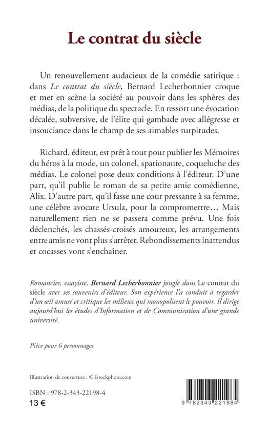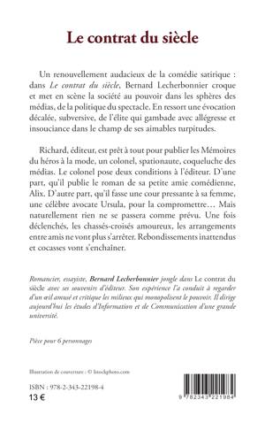 Un renouvellement audacieux de la comédie satirique : dans Le contrat du siècle, Bernard Lecherbonnier croque et met en scène la société au pouvoir dans les sphères des médias, de la politique du spectacle. En ressort une évocation décalée, subversive, de l’élite qui gambade avec allégresse et insouciance dans le champ de ses aimables turpitudes. Richard, éditeur, est prêt à tout pour publier les Mémoires du héros à la mode, un colonel, spationaute, coqueluche des médias. Le colonel pose deux conditions à l’éditeur. D’une part, qu’il publie le roman de sa petite amie comédienne, Alix. D’autre part, qu’il fasse une cour pressante à sa femme, une célèbre avocate Ursula, pour la compromettre... Mais naturellement rien ne se passera comme prévu. Une fois déclenchés, les chassés-croisés amoureux, les arrangements entre amis ne vont plus s’arrêter. Rebondissements inattendus et cocasses vont s’enchaîner.
