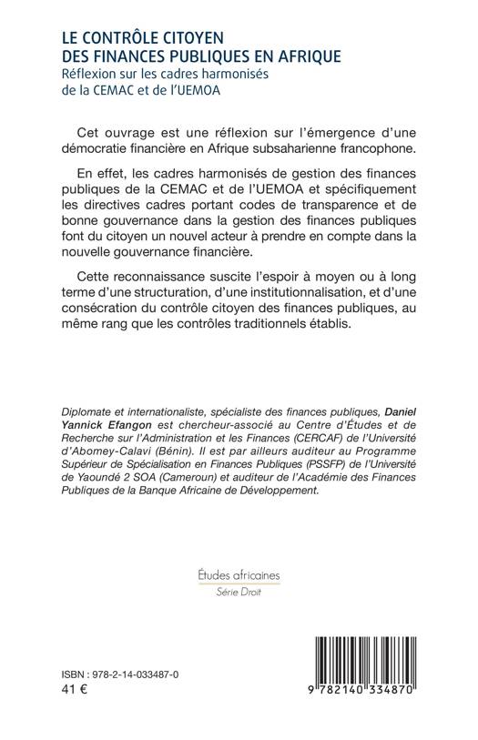 Cet ouvrage est une réflexion sur l'émergence d'une démocratie financière en Afrique subsaharienne francophone. En effet, les cadres harmonisés de gestion des finances publiques de la CEMAC et de l'UEMOA et spécifiquement les directives cadres portant codes de transparence et de bonne gouvernance dans la gestion des finances publiques font du citoyen un nouvel acteur à prendre en compte dans la nouvelle gouvernance financière. Cette reconnaissance suscite l'espoir à moyen ou à long terme d'une structuration, d'une institutionnalisation, d'une reconnaissance et d'une consécration du contrôle citoyen des finances publiques, au même rang que les contrôles traditionnels établis.