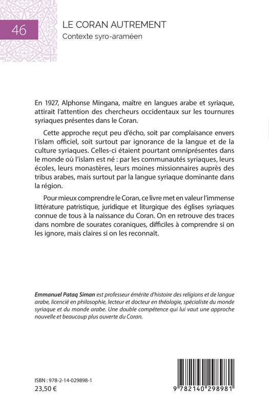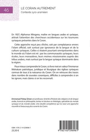 En 1927, Alphonse Mingana, maître en langues arabe et syriaque, attirait l'attention des chercheurs occidentaux sur les tournures syriaques présentes dans le Coran. Cette approche reçut peu d'écho, soit par complaisance envers l'islam officiel, soit surtout par ignorance de la langue et de la culture syriaques. Celles-ci étaient pourtant omniprésentes dans le monde où l'islam est né par les communautés syriaques, leurs écoles, leurs monastères, leurs moines missionnaires auprès des tribus arabes, mais surtout par la langue syriaque dominante dans la région. Pour mieux comprendre le Coran, ce livre met en valeur l'immense littérature patristique, juridique et liturgique des églises syriaques connue de tous à la naissance du Coran. On en retrouve des traces dans nombre de sourates coraniques, difficiles à comprendre si on les ignore, mais claires si on les reconnaît.