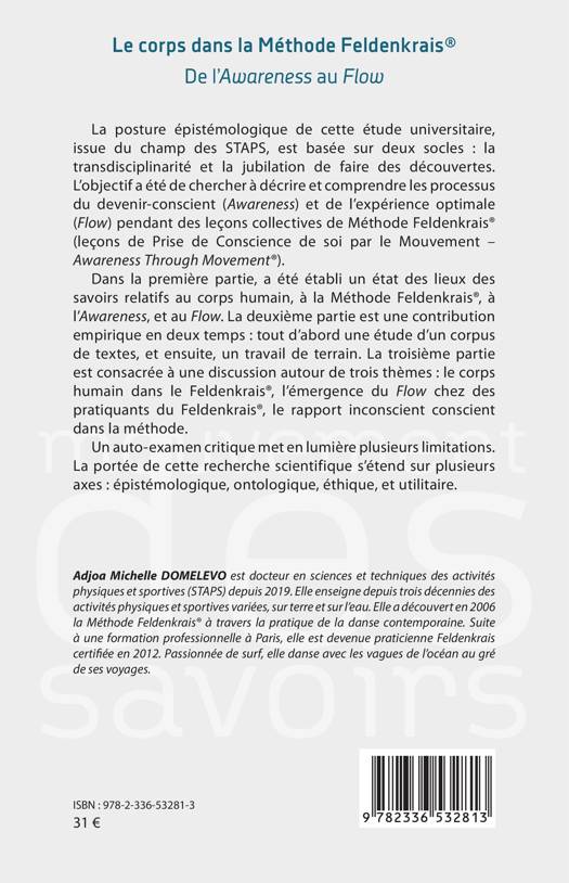 La posture épistémologique de cette étude universitaire, issue du champ des STAPS, est basée sur deux socles: la transdisciplinarité et la jubilation de faire des découvertes. L'objectif a été de chercher à décrire et comprendre les processus du devenir-conscient (Awareness) et de l'expérience optimale (Flow) pendant des leçons collectives de Méthode Feldenkrais(R) (leçons de Prise de Conscience de soi par le Mouvement -Awareness Through Movement(R)). Dans la première partie, a été établi un état des lieux des savoirs relatifs au corps humain, à la Méthode Feldenkrais(R), à l'Awareness, et au Flow. La deuxième partie est une contribution empirique en deux temps: tout d'abord une étude d'un corpus de textes, et ensuite, un travail de terrain. La troisième partie est consacrée à une discussion autour de trois thèmes: le corps humain dans le Feldenkrais(R), l'émergence du Flow chez des pratiquants du Feldenkrais(R), le rapport inconscient conscient dans la méthode. Un auto-examen critique met en lumière plusieurs limitations. La portée de cette recherche scientifique s'étend sur plusieurs axes: épistémologique, ontologique, éthique, et utilitaire.