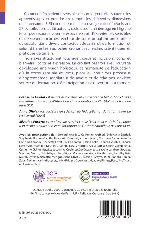 Comment l'expérience sensible du corps peut-elle soutenir les apprentissages et prendre en compte les différentes dimensions de la personne ? Fil conducteur de cet ouvrage collectif réunissant 27 contributions et 36 auteurs, cette question interroge en filigrane le corps-ressource comme espace vivant d'expériences sensibles et de savoirs incarnés, vecteur de transformation personnelle et sociale, dans divers contextes éducatifs et de formation et selon différentes approches croisant recherches scientifiques et pratiques de terrain. Trois axes structurent l'ouvrage: corps et inclusion; corps et bien-être; corps et expression. En croisant ces trois axes, l'ouvrage développe une vision holistique et humaniste de l'éducation où le corps sensible et vécu, placé au coeur des processus d'apprentissage, médiateur de savoirs et de relations, devient source de formation, d'émancipation et d'ouverture au monde.