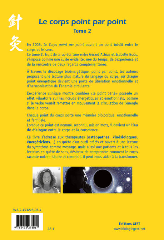 En 2005, Le Corps point par point ouvrait un pont inédit entre le corps et le sens. Ce tome 2, fruit de la co-écriture entre Gérard Athias et Isabelle Boos, s’impose comme une suite évidente, née du temps, de l’expérience et de la rencontre de deux regards complémentaires. À travers le décodage bioénergétique, point par point, les auteurs proposent une lecture plus mature du langage du corps, où chaque point énergétique devient une porte de libération émotionnelle et d’harmonisation de l’énergie circulante. L’expérience clinique montre combien « le point parlé » possède un effet vibratoire sur les nœuds énergétiques et émotionnels, comme si le verbe venait remettre en mouvement la circulation de l’énergie dans le corps. Chaque point du corps porte une mémoire biologique, émotionnelle et familiale. Lorsque ce point est nommé, reconnu, mis en mots, il devient un lieu de dialogue entre le corps et la conscience. Ce livre s’adresse aux thérapeutes (ostéopathes, kinésiologues, énergéticiens…) en quête d’un outil précis et ouvert à une lecture du symptôme comme message, mais aussi aux patients et à tous les lecteurs en quête de sens, désireux de comprendre comment le corps raconte notre histoire et comment il peut nous aider à la transformer.