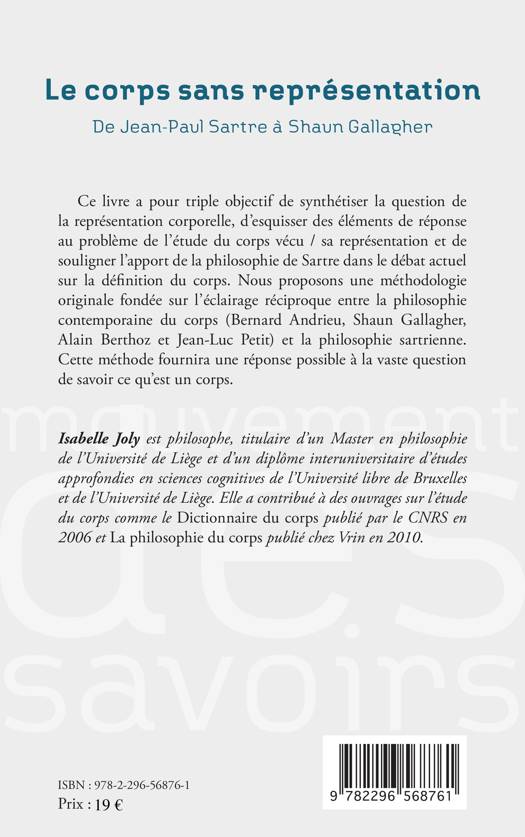 Ce livre a pour triple objectif de synthétiser la question de la représentation corporelle, d'esquisser des éléments de réponse au problème de l'étude du corps vécu / sa représentation et de souligner l'apport de la philosophie de Sartre dans e débat actuel sur la définition du corps. Voici une méthodologie originale fondée sur l'éclairage réciproque entre la philosophie contemporaine du corps et la philosophie sartrienne.
