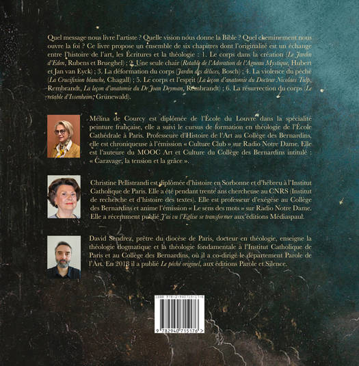 Quel message nous livre l’artiste ? Quelle vision nous donne la Bible ? Quel cheminement nous ouvre la foi ? Ce livre propose un ensemble de six chapitres dont l’originalité est un échange entre l’histoire de l’art, les Écritures et la théologie: 1. Le corps dans la création (Le Jardin d’Eden, Rubens et Brueghel) ; 2. Une seule chair (Retable de l’Adoration de l’Agneau Mystique, Hubert et Jan van Eyck) ; 3. La déformation du corps (Jardin des délices, Bosch) ; 4. La violence du péché (La Crucifixion blanche, Chagall) ; 5. Le corps et l’esprit (La leçon d’anatomie du Docteur Nicolaes Tulp, Rembrandt, La leçon d’anatomie du Dr Joan Deyman, Rembrandt) ; 6. La résurrection du corps (Le retable d’Issenheim, Grünewald).