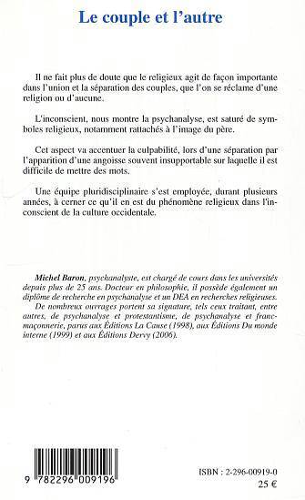 La religion agit de façon importante dans l'union et la séparation des couples, que l'on se réclame d'une religion ou d'aucune. L'inconscient est saturé de symboles religieux, notamment rattachés à l'image du père. Analyse du phénomène religieux dans l'inconscient de la culture occidentale.